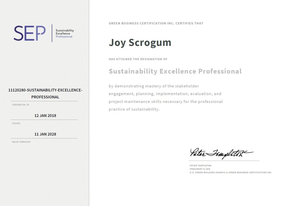 - Sustainability Excellence Professional (SEP; formerly International Society of Sustainability Professionals Certified Sustainability Professional, or ISSP-CSP), January 2018 – January 2028.
